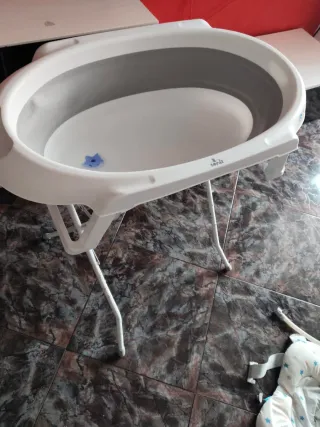Bañera para bebé con un diseño ergonómico y soporte. - Color blanco y gris. - Patas de soporte estables. - Se incluye reductor para recien nacido. Lo único que tiene es el óxido en las puntas de las patas, del agua. El resto perfecto.