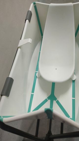 Bañera portatil. Con patas. Las almuadillas verdes son de goma para que el bebe no se deslice. Se pueden poner unas barras extensibles para adaptar a la bañera de casa. Las barras se venden aparte por 20€ .Todo el conjunto 40€