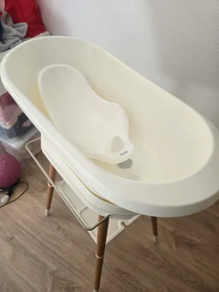 Bañera para bebé de la marca Jou, en perfecto estado. Incluye soporte de madera con patas en madera y blanco y bañera en gris clarito. Incluye tambien un toallero y el soporte de baño para recien nacido. Tiene el hueco para el termometro digital y el sensor. Se vende sin el termometro porque se oxidaron las pilas y se estropeo, pero si se puede comprar a parte, tener en cuenta que tiene el hueco. Es muy comoda para el baño del bebe y para la espalda, y ocupa poquito espacio en la habitacion.