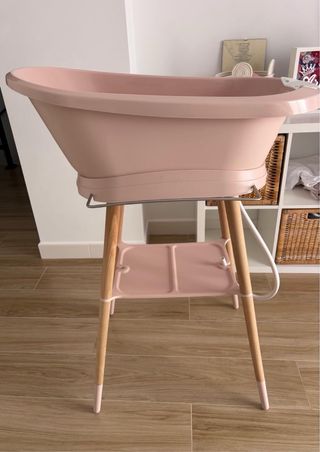 Preciosa bañera para bebé de la marca Jou, en color rosa empolvado. Incluye soporte de madera de diseño nórdico y cubeta adicional. Bañera para bebes con adaptador desde cero meses, de temperatura exterior, del agua y temporizador, tubo de vaciado. Tiene una grieta en la parte de atrás del embellecedor de una pata trasera (he visto que le ha pasado a más gente, entiendo que es un defecto de este modelo) un pixel de la pantalla parpadea,en la ultima foto se puede ver en el 1 q sale menos nítido - Bañera de plástico resistente. - Soporte de madera de haya maciza. - Diseño elegante y funcional. - Perfecto estado.