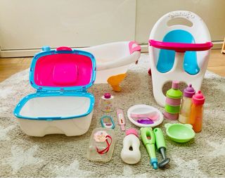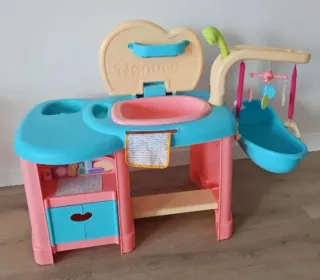 Set de cambiador y bañera de la marca Nenuco. - Incluye cambiador con lavabo. - Bañera con soporte. - Colgante con juguetes. - Cuna con pelotas.