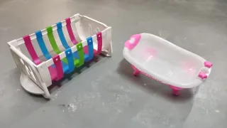 Conjunto de cuna y bañera para muñecas Nenuco . - Cuna blanca con tiras de colores (rosa, azul, verde). - Bañera blanca con detalles rosas y patas.