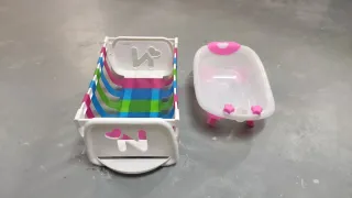 Bañera de juguete Nenuco con accesorios. - Estructura de plástico resistente. - Colores vibrantes: rosa, azul y naranja. - Incluye móvil de cuna y otros complementos.
