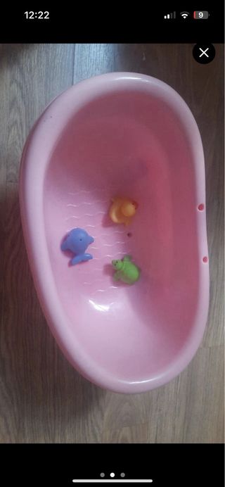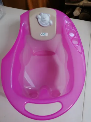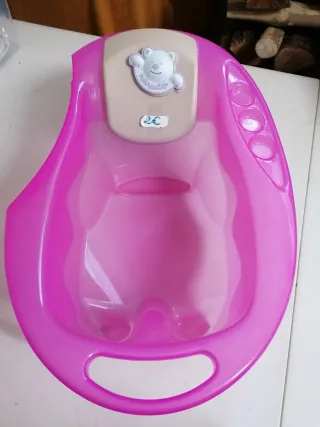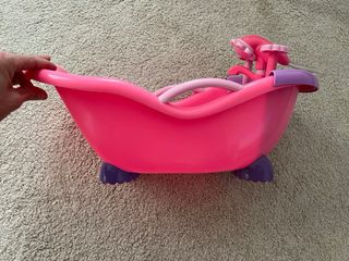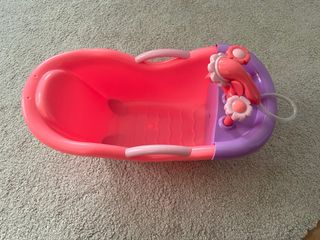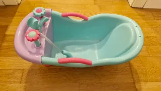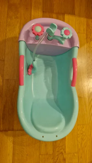 Divertida bañera de juguete para bebés estilo Nenuco, ideal para juegos. - Color rosa vibrante. - Incluye accesorios de baño. - Diseño divertido y seguro. - La ducha y el grifo funcionan, echan agua si aprietas los botones - Comprada en El Corte Inglés