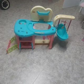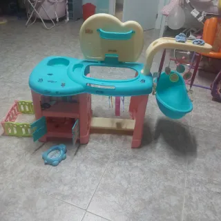 Centro de juegos Nenuco. - Incluye cuna, bañera y trona. - Estructura de plástico resistente. - Tonos rosa y azul. Tiene dañadas las pegatinas, el resto todo perfecto.