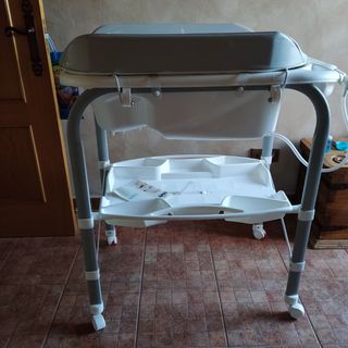 Bañera y cambiador para bebés, ideal para el cuidado diario. - Estructura plegable - Bandeja inferior para accesorios. - Ruedas para facilitar el desplazamiento. - Tubo para vaciar bañera en el bidet No tenemos el cojín de arriba.