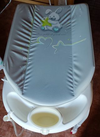 Bañera para bebés que también tiene cambiador. Para ponerse sobre el inodoro o el bidet. Muy práctica y cómoda. Se puede plegar cuando no se usa, ocupando poco espacio. Tiene marcas por uso, como se puede observar en las fotos, pero cumple perfectamente su función.