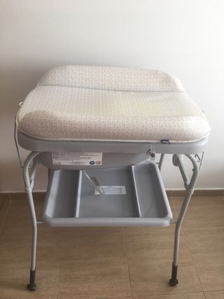 Cambiador bañera Chicco Bubbles Altura regulable. Es muy estable La bañera puede usarse por separado. El tapizado del cambiador en buen estado, aunque el color es el de la foto. Yo lo puse sobre el bidet y es muy práctico.