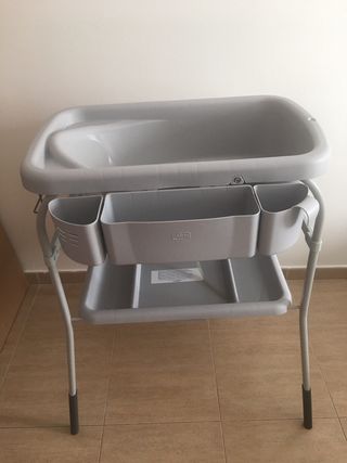 Mueble cambiador con bañera para bebé, en buen estado. Ideal para facilitar el baño y el cambio de pañales. - Incluye bañera integrada. - Recipiente para jabón - Estructura de madera con diseño gris. - Con ruedas para facilitar su movilidad - Cojin y funda cambiador originales La tabla inferior no esta ya que ha sido retirada para estar sobre el bidet (como se ve en las fotos) Las baldas grises están forradas. Son originalmente beige. Ideal para el baño de recién nacidos y como mueble! Entrego en Cornella, puedes venir a verlo.