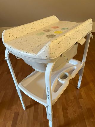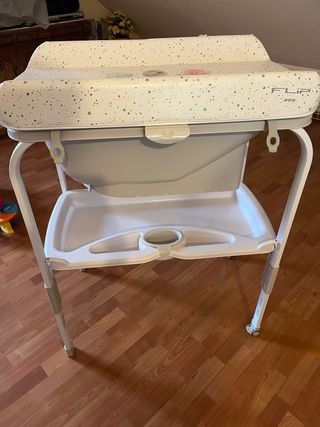 Cambiador y bañera para bebé de la marca Jané, modelo Flip. Ideal para el cuidado del bebé. Aunque la bañera no aparece en las fotos , es gris y con almohadillas antideslizantes . La bañera tiene un lado adaptado con reductor al recién nacido y el otro para poder sentarse a partir de los 6 meses. - Estructura metálica. - Cambiador con estampado de cuadros gris y blanco. - Bandeja inferior. - Ruedas para facilitar el movimiento y freno. - Medida ideal para colocar sobre bidet.