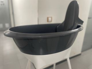 Soporte de bañera Hoppop con barra para toalla (la bañera se nos rompió en la mudanza, pero aún las venden, nuevas y por aquí). La compramos porque eran con diferencia las más estables (tanto abiertas como plegadas, que caben detrás de una puerta) y nos servía para poner la bañerita sobre el bidet (teníamos un baño enano). La última foto es de la bañera que encaja con esas patas, no está incluida (para quién ya la tenga o la quiera buscar. Es de doble pared y aguanta fenomenal la temperatura del agua).