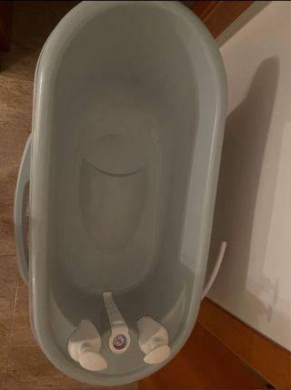 Bañera bebé para uso desde el primer baño gracias al accesorio tipo hamaca, q es útil hasta los 8 meses o 9 kilos. Tiene una goma para desaguar, en nuestro caso lo pusimos encima del bidet y resulta comodo. En caso de querer movilizarla las patas se desmontan con un clic, muy fácil