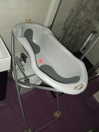 Bañera para bebé de 0 a 12 meses. * Compacta (40 x 60 x 35 cm) y ligera (1,2 kg): Dimensiones con soporte desplegado: 60x80x105 cm. * Ergonómica: respaldo de espuma y fondo con forma para mantener al bebé estable durante el baño. * Segura: soporte plegable con bases antideslizantes en las patas. Practicamente nueva y sin uso por estar en segunda residencia.
