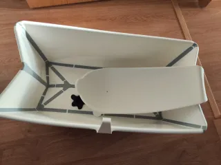 Bañera plegable Stokke Flexbath en color blanco compacta y fácil de guardar. - plegable - Incluye TAPÓN normal que cambia de color con la TEMPERATURA del agua (si está demasiado caliente se vuelve rojizo). - Incluye TAPÓN con MANGUERA para cuando se usa el soporte alto. ### SOPORTE ### para tener la bañera alta y a mano sin tener que agacharte. En donde se rozan los tubos tiene pintura que ha saltado y oxido superficial. Es solo estetico por lo que funcionalmente todo está correcto###