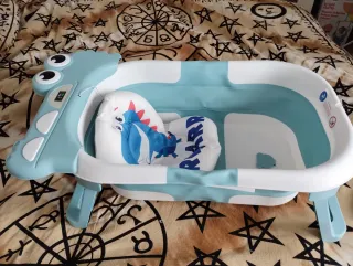 Bañera plegable para bebe con cojin reductor. perfecta para viajar que es el uso que le hemos dado nosotros. Pesa muy poco.muy poco uso. incluye en cojin. con embalaje. Tamaño de la Bañera 83x50x21.plegada es muy facil de guarfar
