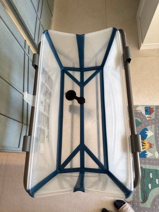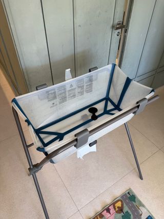 Bañera Stokke con patas para bebé. Diseñada para la comodidad y seguridad. Transparente y azul - Patas plegables para un fácil almacenamiento. - Materiales duraderos y seguros para el bebé. - Con tubo de desagüe para facilitar el vaciado Incluye reductor para recién nacido Tiene algo de oxido en las juntas de las patas, pero funciona perfectamente.
