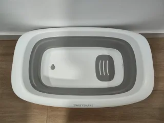 Bañera plegable para bebés de la marca Twistshake. - Color blanco y gris. - Estructura plegable para ahorrar espacio. - Base antideslizante. Se encuentra en buen estado pero tiene marcas de uso: en algunas zonas se nota que ha amarilleado porque en el baño se empleaba aceite de camomila y la estructura tiene algo de óxido por el agua pero es perfectamente funcional.