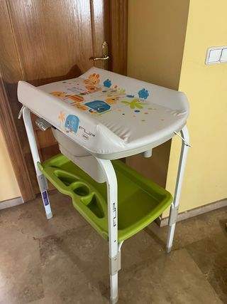 Cambiador de bebe plegable con bañera. En buen estado, muy poco uso, solo falta la goma de desagüe. El cambiador está nuevo y sin usar. Desde el nacimiento hasta los 12 meses Medidas del producto Abierta: 85 x 52 x 106 cm Cerrada: 85 x 26 x 98 cm Peso del producto 8,5 Kg - Estructura metálica. - Bandeja de plástico. - Cubeta de plástico.