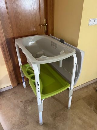 Completamente nueva usada dos veces BAÑERA CON CAMBIADOR 2 EN 1 AJUSTABLE EN ALTURA: Sus patas pueden regularse en 3 posiciones ASIENTO EVOLUTIVO: cuenta con un asiento de 2 posiciones para mayor comodidad del bebé (semi tumbado o sentado) PLEGABLE: puede cerrarse de forma compacta ocupando poco espacio y guardarla fácilmente CAMBIADOR CON REDUCTOR: podrás cerrar la tapa y utilizar el cambiador que viene equipado con un práctico reductor para los más pequeños. CÓMODO DESAGÜE: podrás vaciar la bañera de forma cómoda abriendo el práctico tapón y colocando el tubo del desagüe.