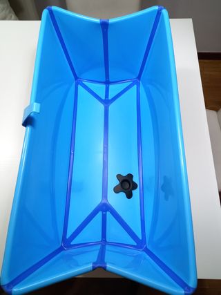 Bañera para bebé Stokke plegable, en buen estado. Es ligera y fácil de guardar. Color azúl. - Plegable para facilitar el almacenamiento. - Material plástico resistente y transparente. - Incluye tapón de desagüe. 64cm de largo 30cm de ancho 25cm de alto