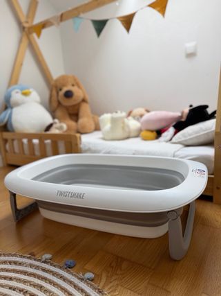 Bañera plegable de la marca Twistshake con una capacidad de 30 litros. Ideal para ahorrar espacio.Diseño plegable para fácil almacenamiento.Color blanco y gris. Incluye soporte para jabón o accesorios. Plegable por completo, incluyendo las patas, lo que la hace muy fácil de guardar en espacios pequeños, como dentro de un plato de ducha, cuando no se usa .Tiene una capacidad de 30 litros. Cuenta con un tapón de desagüe incorporado en la parte trasera para vaciar el agua cómodamente. El cojín reductor facilita uso y secado rápido, ayudando a sostener al bebé durante el baño. (Presenta un cosido por un enganchón.)