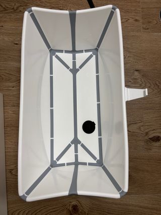 Bañera plegable Stokke, diseñada para facilitar el baño del bebé y optimizar el espacio. - Diseño plegable para un fácil almacenamiento. - Materiales de calidad y seguros. - Color blanco con detalles grises.
