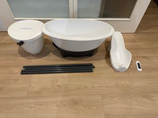 Set de bañera para bebé de la marca Luma, ideal para los primeros baños. Incluye varios accesorios para facilitar el cuidado del bebé. - Bañera blanca. - Soporte para bañera. - Reductor de asiento. - Cubo con tapa. - Termometro para el agua