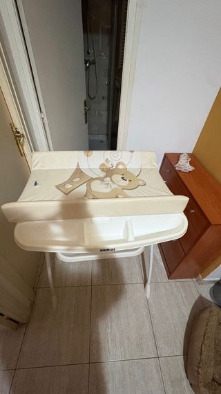 Cambiador para bebé con bañera integrada. - Diseño con estampado de osito. - Cubeta anatómica. - Patas estables. -Bandeja para organizar los productos de higiene. Incluye de regalo la colchoneta para que no se hunda el bebe. La bañera se puede plegar y no ocupa nada de espacio, se abre el cambiador con una sola mano. Solo 1 mes de uso