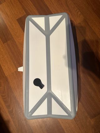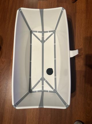 Bañera plegable de la marca Stokke, diseñada para la comodidad y el espacio. Tiene un detalle en una esquina (ver foto) pero no altera su uso. - Diseño plegable para fácil almacenamiento. - Materiales resistentes y seguros. - Color blanco y azul.