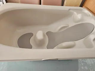 Bonita bañera evolutiva para utilizar desdé recién nacido hasta los 6 años, fácil de usar y no ocupa espacio