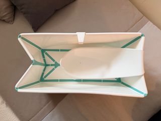 Bañera plegable Stokke en perfecto estado. Es blanca con detalles en verde menta. - Plegable para facilitar el almacenamiento. - Material plástico resistente y fácil de limpiar. - Incluye tapón de desagüe.