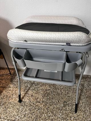 Bañera cambiador de la marca Chicco. - Estructura gris. - Cambiador acolchado con estampado. - Compartimentos para organizar. - Bandeja inferior.