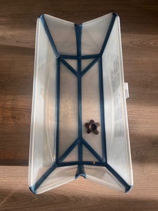 Bañera Stokke plegable para bebés. Diseñada para facilitar el baño del bebé y su posterior almacenamiento. - Estructura metálica. - Tina de plástico translúcido. - Plegable para ahorrar espacio. viene con el accesorio para poder bañar bebes,todo nuevo cuesta 140 euros y solo tiene un año y medio
