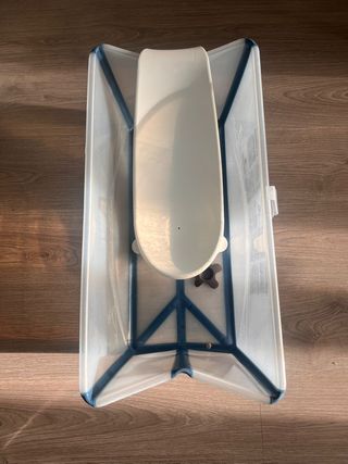 Bañera plegable de la marca Stokke, modelo XL. - Diseño plegable para un fácil almacenamiento. - Material translúcido con estructura de soporte azul.