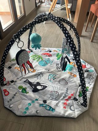 Alfombra de actividades con un divertido diseño de temática marina, ideal para el entretenimiento de los más pequeños. Se pliega fácilmente para su almacenamiento. - Diseño con animales marinos como peces, pulpos y orcas. - Colores vivos y atractivos. - Material suave y acolchado.