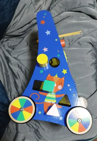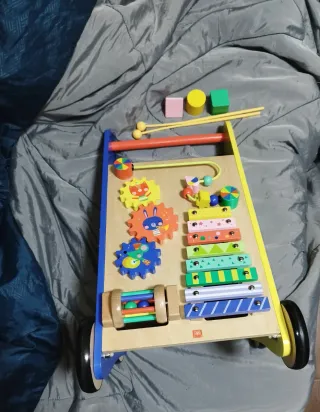 Correpasillos y centro de juegos de madera para bebés y niños pequeños. Fomenta el desarrollo de habilidades motoras finas y gruesas. Marca Eureka kids modelo Circus. Montessori. - Incluye xilófono con 8 notas de colores y baquetas. - Engranajes giratorios con dibujos de animales. - Laberinto de cuentas de colores. - Ruedas para empujar y caminar. - Rodillo giratorio. - Encaje de piezas con las piezas incluidas. - Disco madera giratorio sube y baja. Parte trasera para almacenamiento y transporte de juguetes.