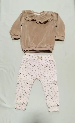 Conjunto de dos piezas para bebé. - Sudadera de terciopelo en color marrón con cuello volante. - Pantalón estampado de pájaros y ramitas. Marca feetje.