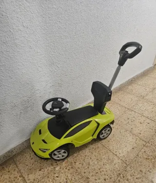 Coche correpasillos con diseño deportivo inspirado en Lamborghini. - Color amarillo brillante. - Volante. - Empuñadura para empujar. Bien cuidado