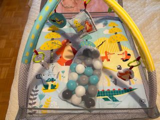 Gimnasio de actividades para bebés con un diseño divertido y educativo. - Incluye varios juguetes colgantes. - Tapete con estampado de animales y naturaleza. - Estructura de arcos para colgar los juguetes.