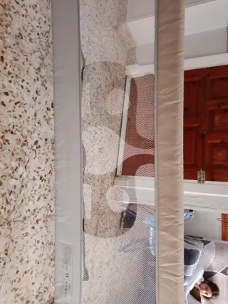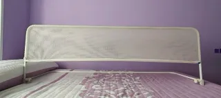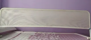 Barandilla de seguridad para cama, ideal para niños. Fabricada con una estructura metálica y malla transpirable. - Estructura de metal blanco. - Malla de tela blanca. - Mecanismo de ajuste. Un poco deteriorada del uso