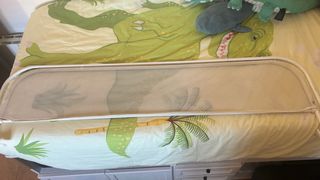 Barandilla de seguridad para cama infantil, ideal para evitar caídas durante la noche. Fabricada con materiales resistentes y un diseño práctico. - Estructura de tela y malla transpirable. - Bordes reforzados en gris. - Incluye cintas de sujeción blancas.