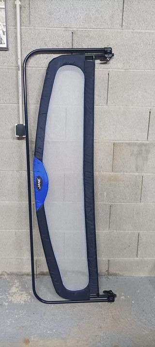 Barandilla de seguridad para cama de la marca Jane. Es plegable y fácil de instalar. - Tejido de malla transpirable. - Estructura metálica. - Color azul y negro. - le falta una pestaña pero no afecta al uso
