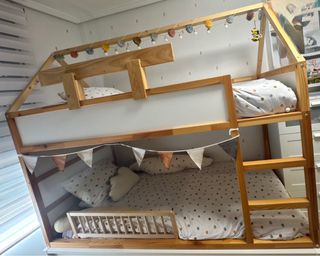 Cama litera Kura de IKEA, con modificaciones como simular tejado de casita.Con una barandilla adaptada a esa cama (arriba)es reversible para adaptarse a tus necesidades.Se vende sin colchones y solo con un somier en este caso el de la cama de arriba - Estructura de madera. - Diseño versátil.