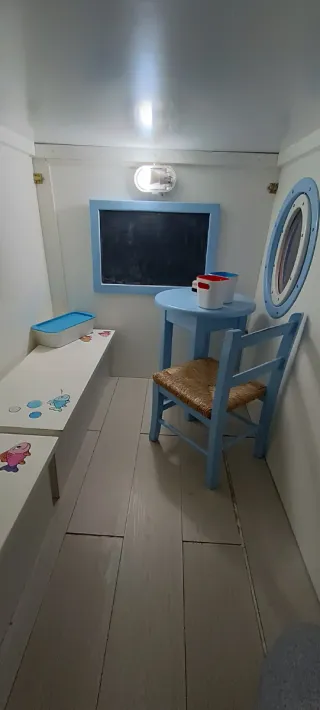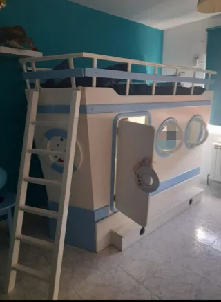 Divertida cama con forma de barco, ideal para habitaciones infantiles. Dispone de dos camas, una arriba y otra abajo tipo nido. - Diseño temático de barco. - Escalera de acceso. - Ventanas tipo ojo de buey. - Puerta de entrada. - Barandilla superior. - Camarote interior
