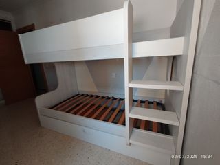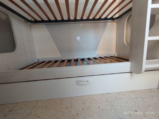 Litera infantil de tres camas en perfecto estado. Es blanca lisa y blanca con betas. Está compuesta por dos camas superpuestas y una cama inferior extraíble. - Estructura robusta y resistente. (Es de Moblerone) - Diseño moderno y elegante. - Tiene menos de 3 años. - Se vende por mudanza. - Se regala la barandilla para la cama de arriba. - Ya está desmontada. - Posibilidad de transporte. - Nueva costó 1000€ con los somieles. Precio algo negociable.