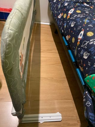 Barandilla de seguridad para cama infantil. Ayuda a prevenir caídas durante la noche. - Diseño con estampado espacial y jirafas. - Malla transpirable. - Estructura de fácil montaje. No tiene marcas picadas y la tela está perfecta. También se puede recoger al lado de Manresa.