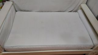 Cama - cuna evolutiva IKEA con 2 tipos de colchones, espuma y visco, con fundas para todas las piezas, somier enrollable. Se regala barandilla. Las sábanas no están incluidas. En muy buen estado. Las sombras del blanco son por un plafón que está fundido.