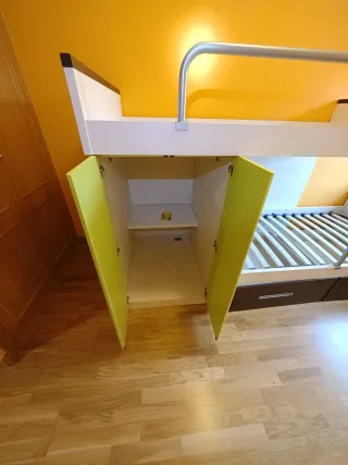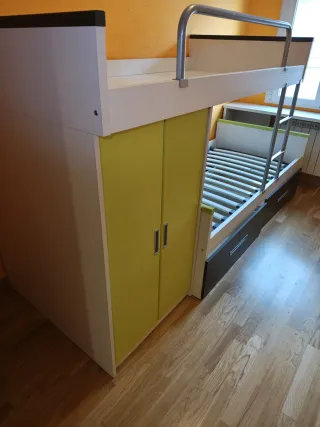 Litera modelo Lasan con un diseño moderno y funcional, ideal para optimizar el espacio. - Armario integrado con puertas. - Cajones de almacenamiento. - Escalera de acceso a la cama superior. - Barandilla de seguridad. Cama de abajo más pequeña que la de arriba. No se hace envío