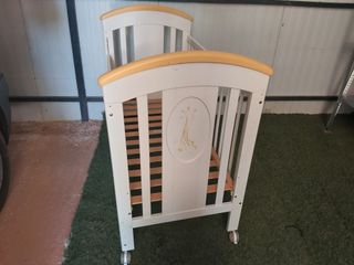 Cuna con 3 alturas para poder poner el somier, barandilla para bajar y subir,con ruedas,{se da con el colchón el colchón tiene su parte de invierno y parte de verano , sin apenas uso}y con el edredón, juegos de sábanas y chichoneras} No es negociable.