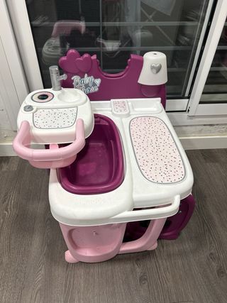 Conjunto de juego para muñecas que incluye cuna, cama y trona. - Cuna con detalles en rosa y blanco. - Cama con barandillas. - Trona con lavabo y accesorios.